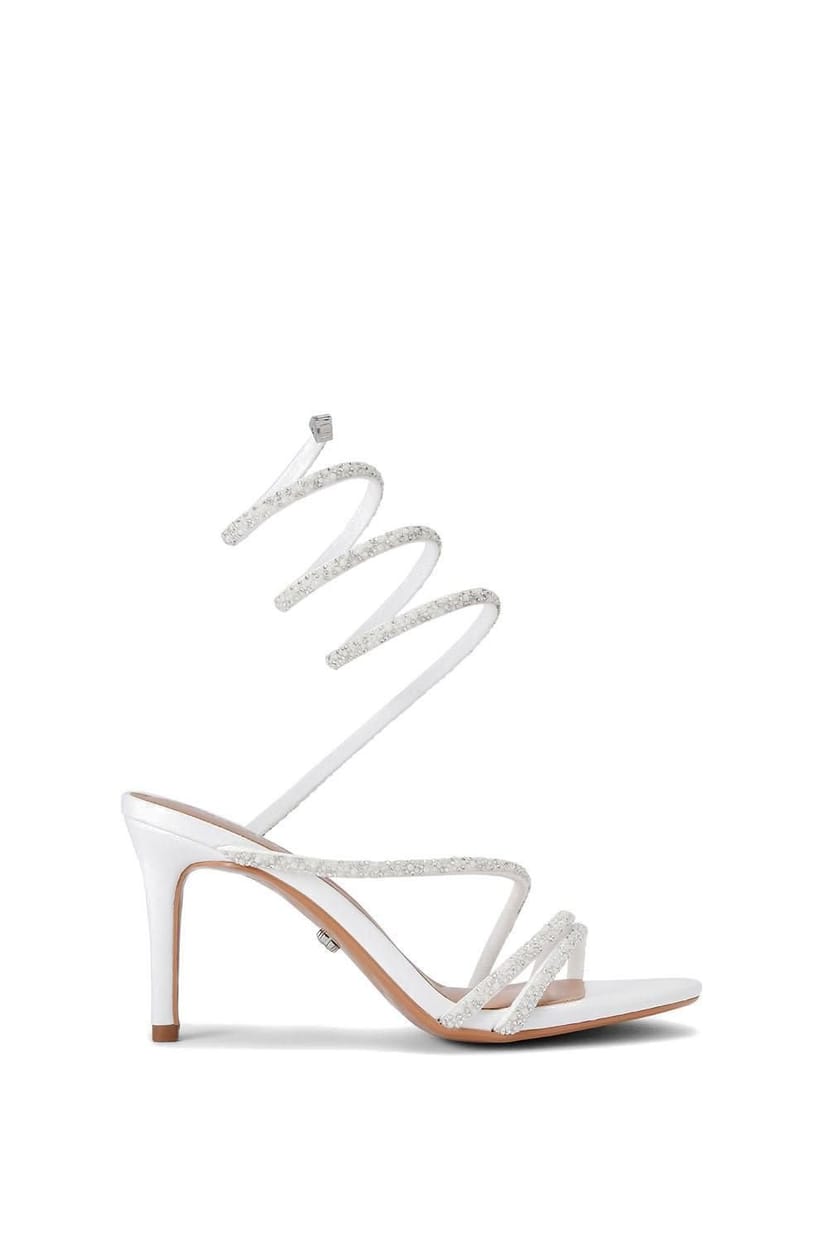 Elegant white heels with a crystal embellished strap that wraps around the ankle and continues across the foot and toe to elongate the leg. The heel height is 8cm, and the shoes feature All Day Long Technology for added comfort.
