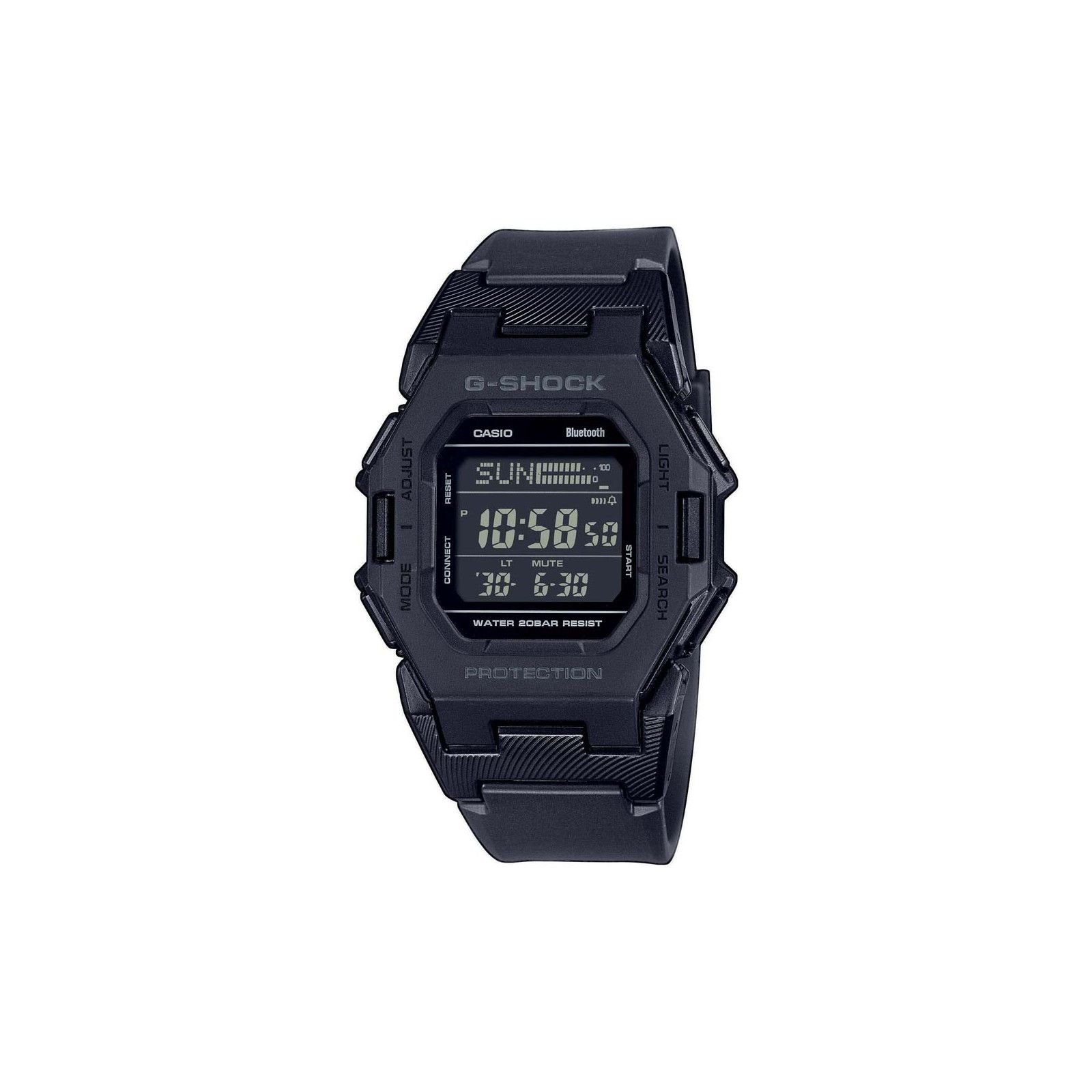 Robust black resin Casio G-Shock watch with a digital display and Bluetooth connectivity. Designed for durability and functionality, perfect for everyday wear.
