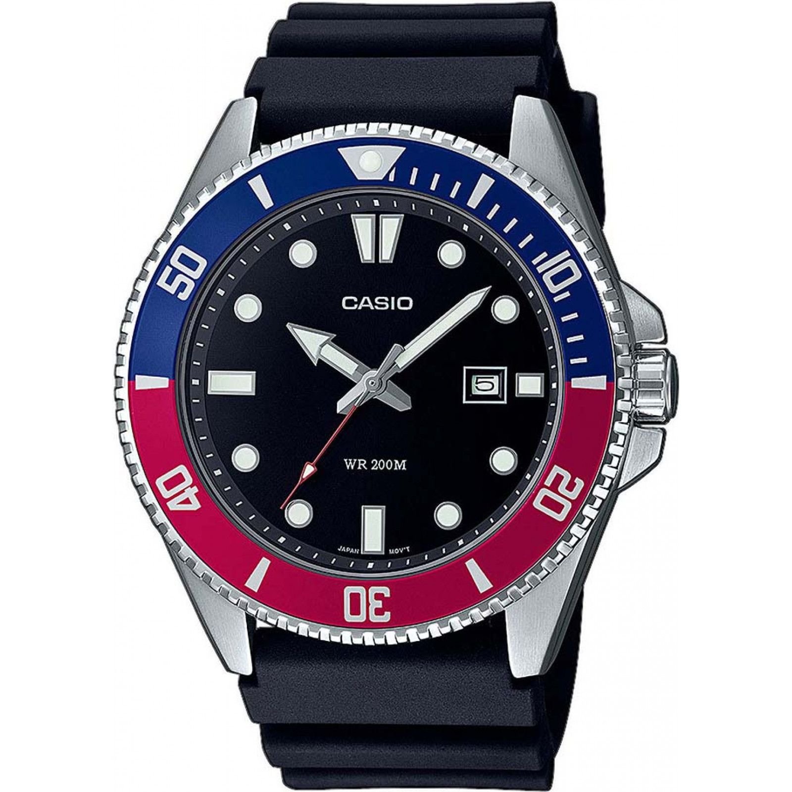 Stylish Casio MDV-107-1A3VEF men's watch with a black dial, blue and red accents, and a black resin strap. Designed for durability and style, this watch is perfect for everyday wear.