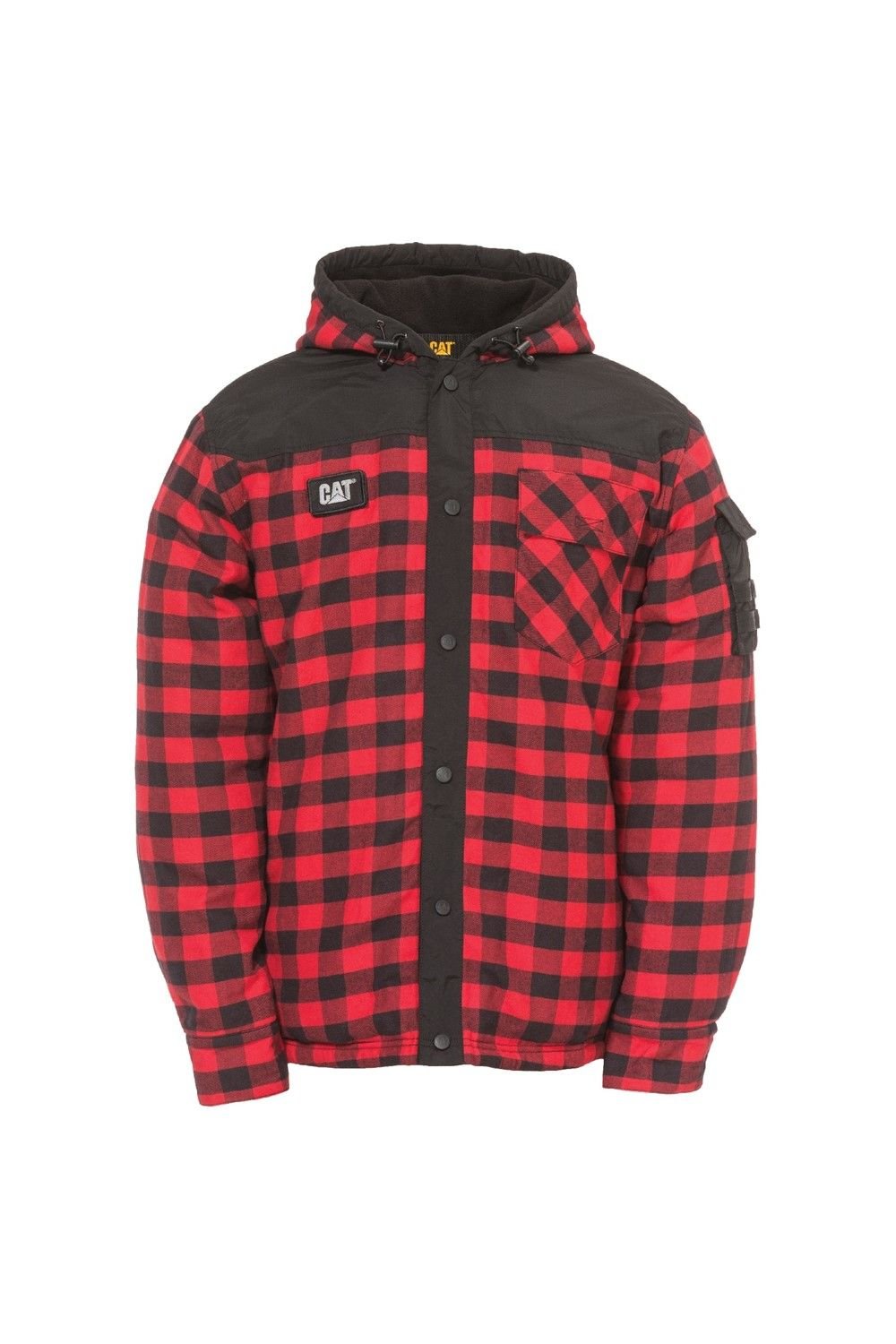 Bold red and black plaid jacket with a warm fleece lining and durable nylon overlays. Features a hood and multiple pockets for practicality. Ideal for outdoor activities.