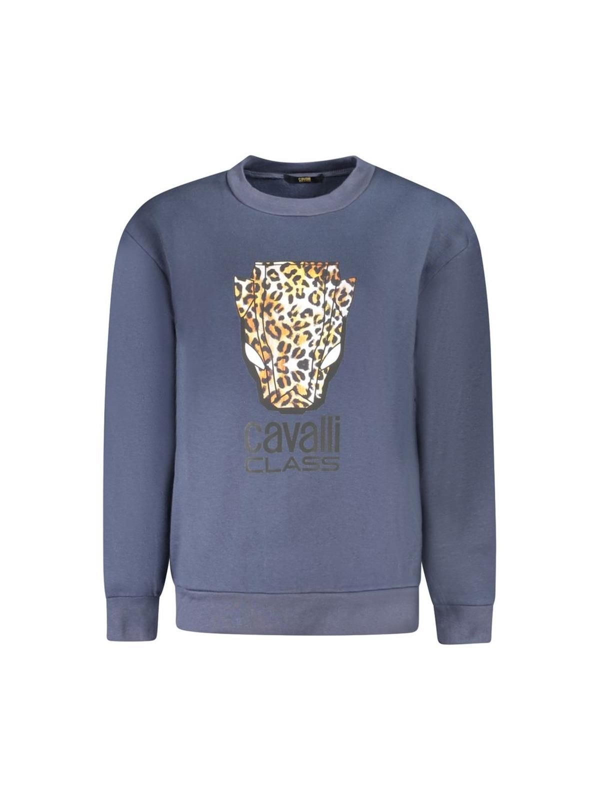 Stylish blue cotton sweater from Cavalli Class. Featuring a bold leopard print on the front, this piece combines comfort with a fashion-forward design. Ideal for casual wear or layering.