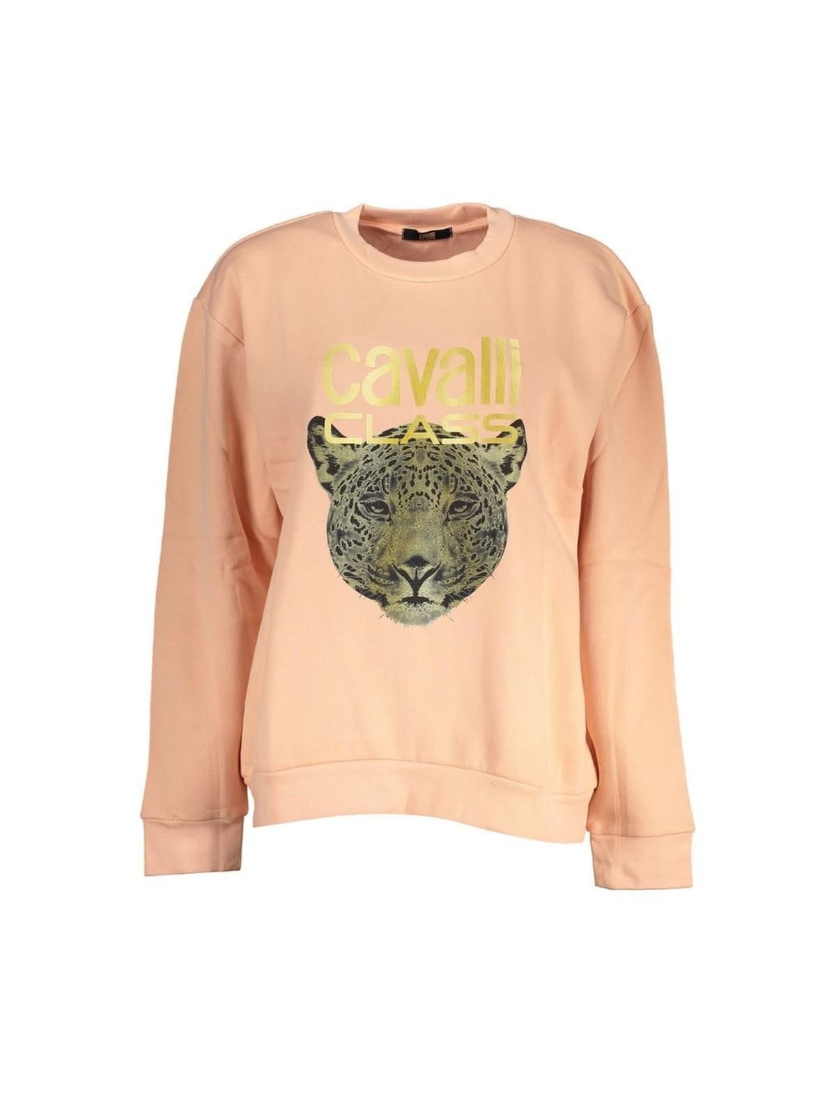 Chic pink fleece crew neck sweatshirt by Cavalli Class. Features a stylish leopard print on the front, perfect for casual wear. Made from a blend of cotton and fleece for comfort and warmth.