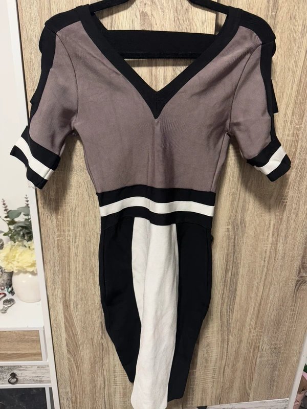 The Celeb Boutique Grey and White Bodycon V-Neck Dress is available in sizes M.