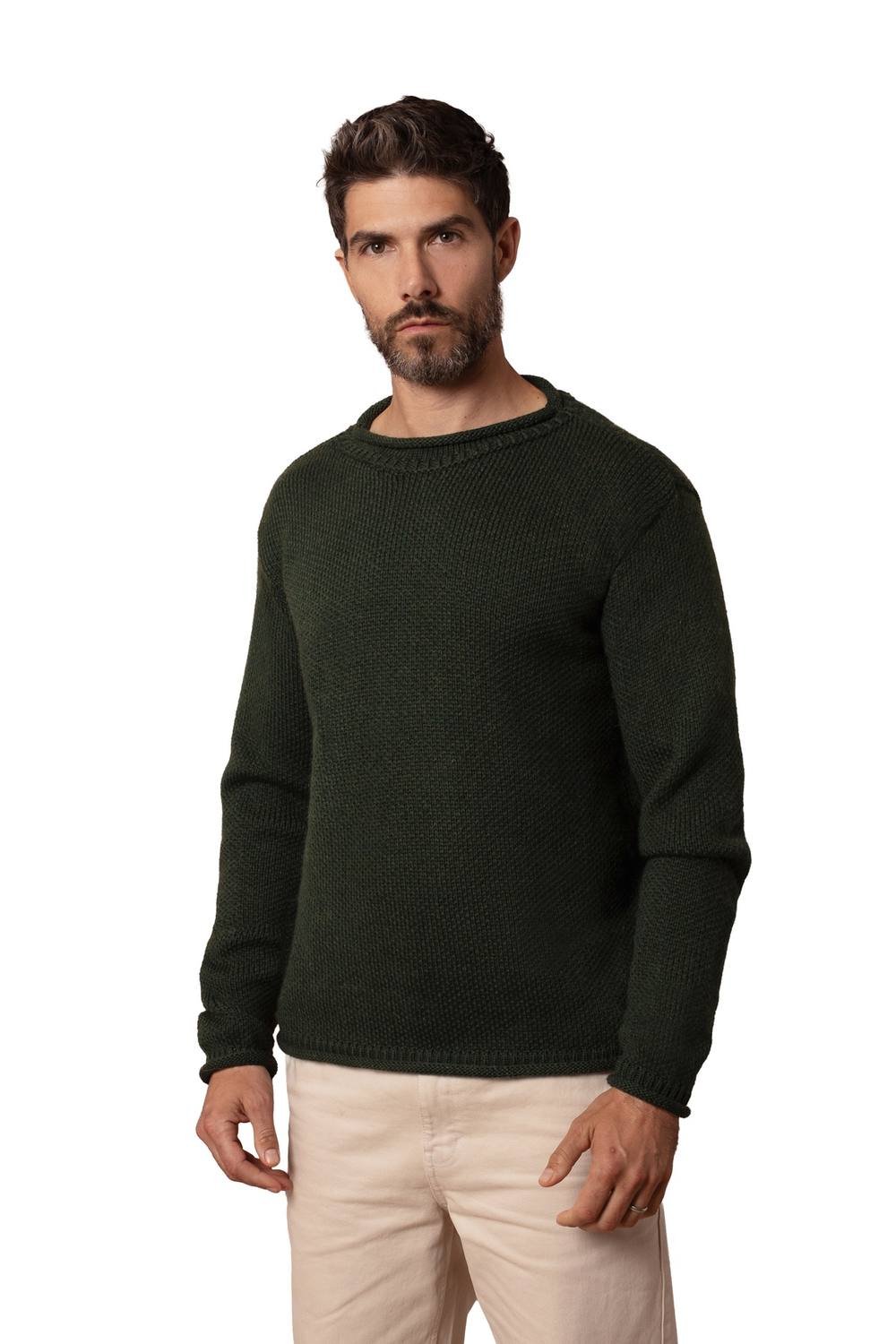 Classic crew neck sweater in bottle green featuring a traditional rolled edge collar, cuffs, and hem. Knitted in a textured moss stitch for a subtly distinctive look. Perfect for all occasions from hikes to evening drinks.