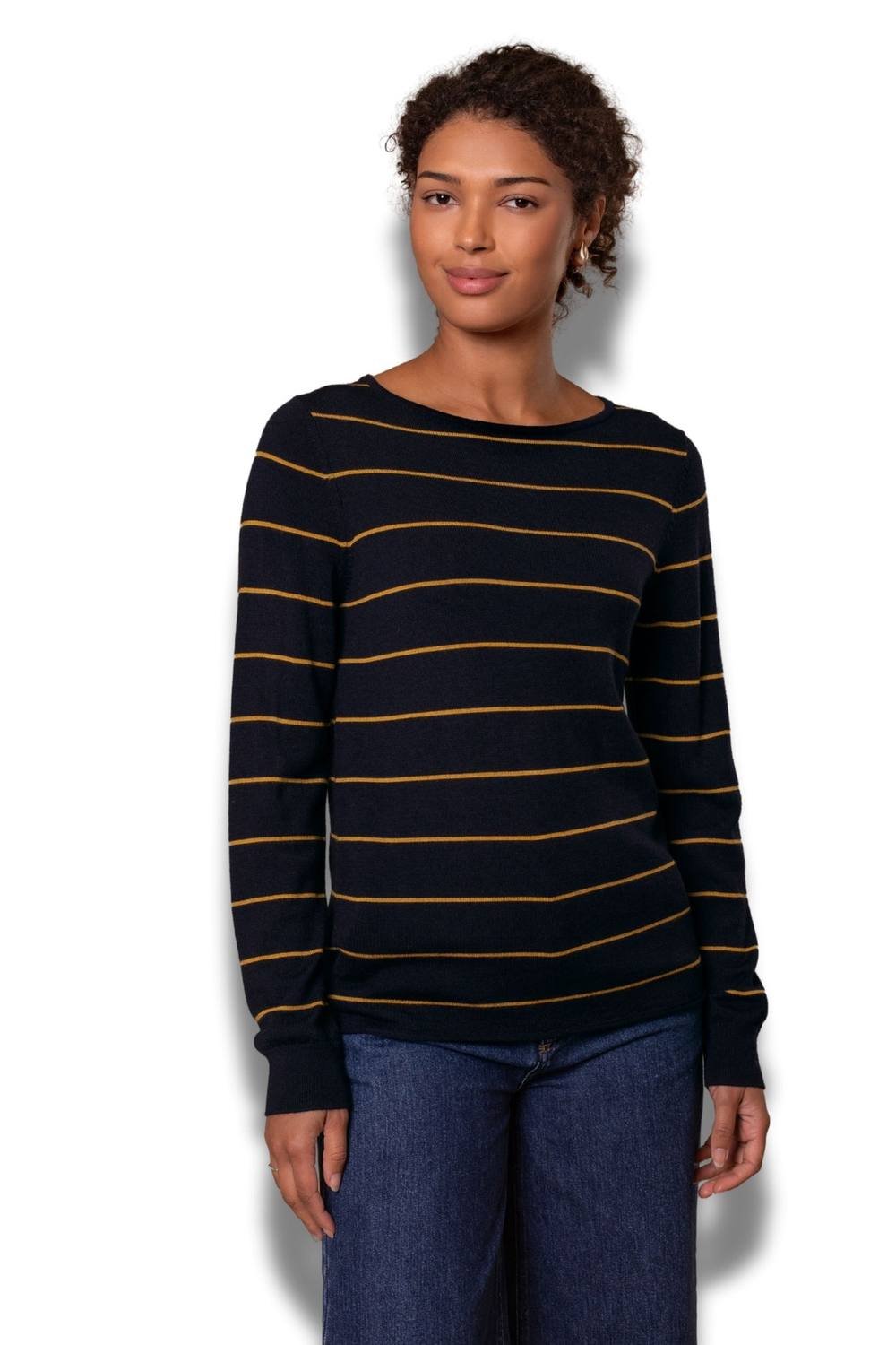 Stylish boat neck jumper in dark navy and gold stripe pattern. Made from Ultrafine Merino wool, this piece offers breathability and warmth. Ideal for everyday wear.