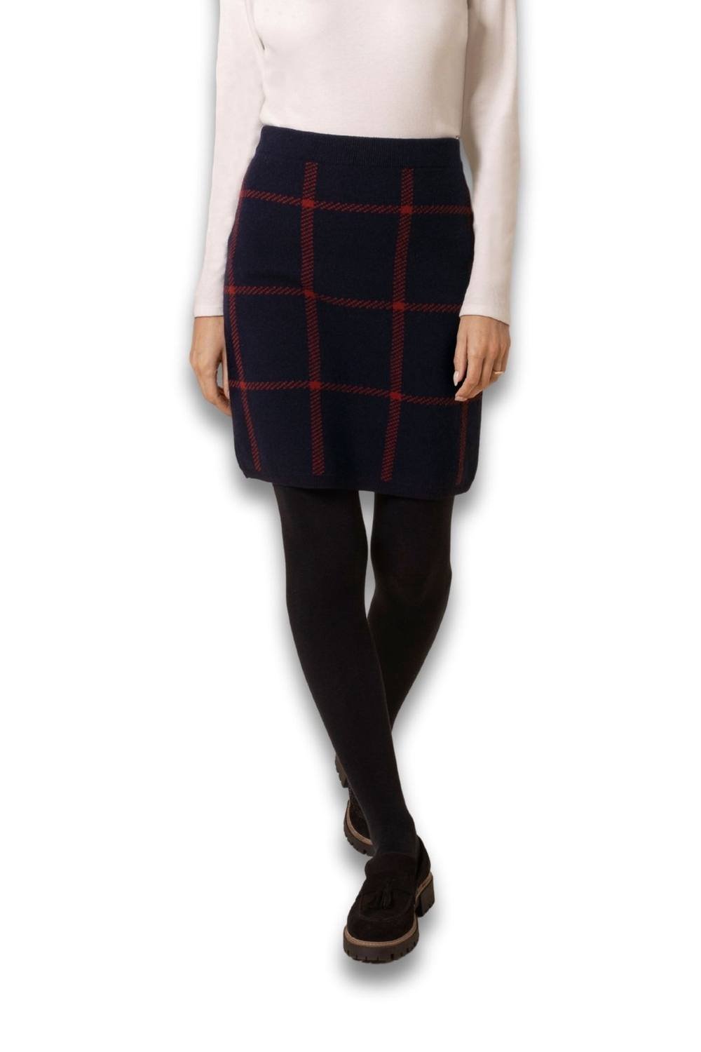 Stylish mini skirt in navy with a windowpane check pattern. Made from lambswool, it features an elasticated waistband for comfort. Ideal for casual and semi-formal occasions.