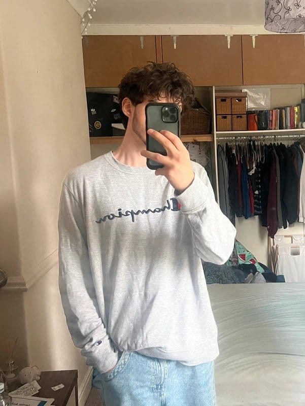 The Champion Grey Baggy Sweater is available in sizes XL.