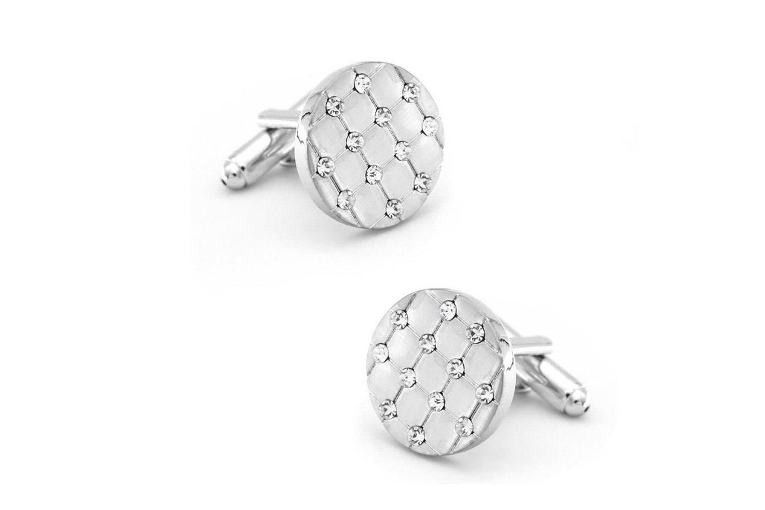 Stylish silver round cufflinks with a diamond pattern and studded stones. High-quality, lightweight design for comfort. Perfect for formal occasions.