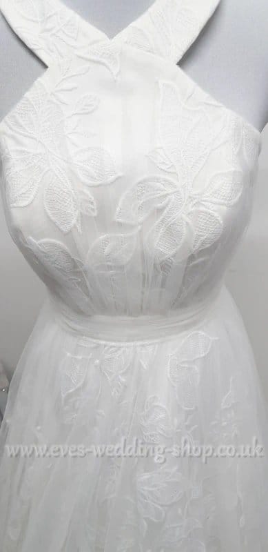This stunning Charlotte Bridal ivory lace and tulle wedding dress features a high neck and a cute bow at the back. Ideal for brides seeking sophistication and elegance.