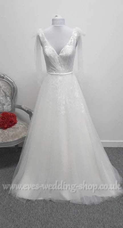 “Pair with pearl earrings and a white satin clutch for a classic bridal look.”