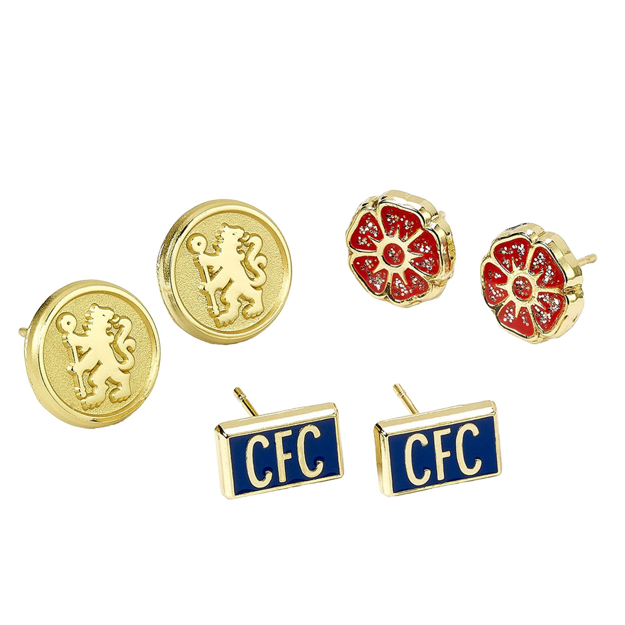 Officially licensed Chelsea FC stud earrings set in ecru with assorted designs. Features a lion crest, text, and red accents. Made from hypo-allergenic metal with a gold finish. Perfect for ages 14 and up.