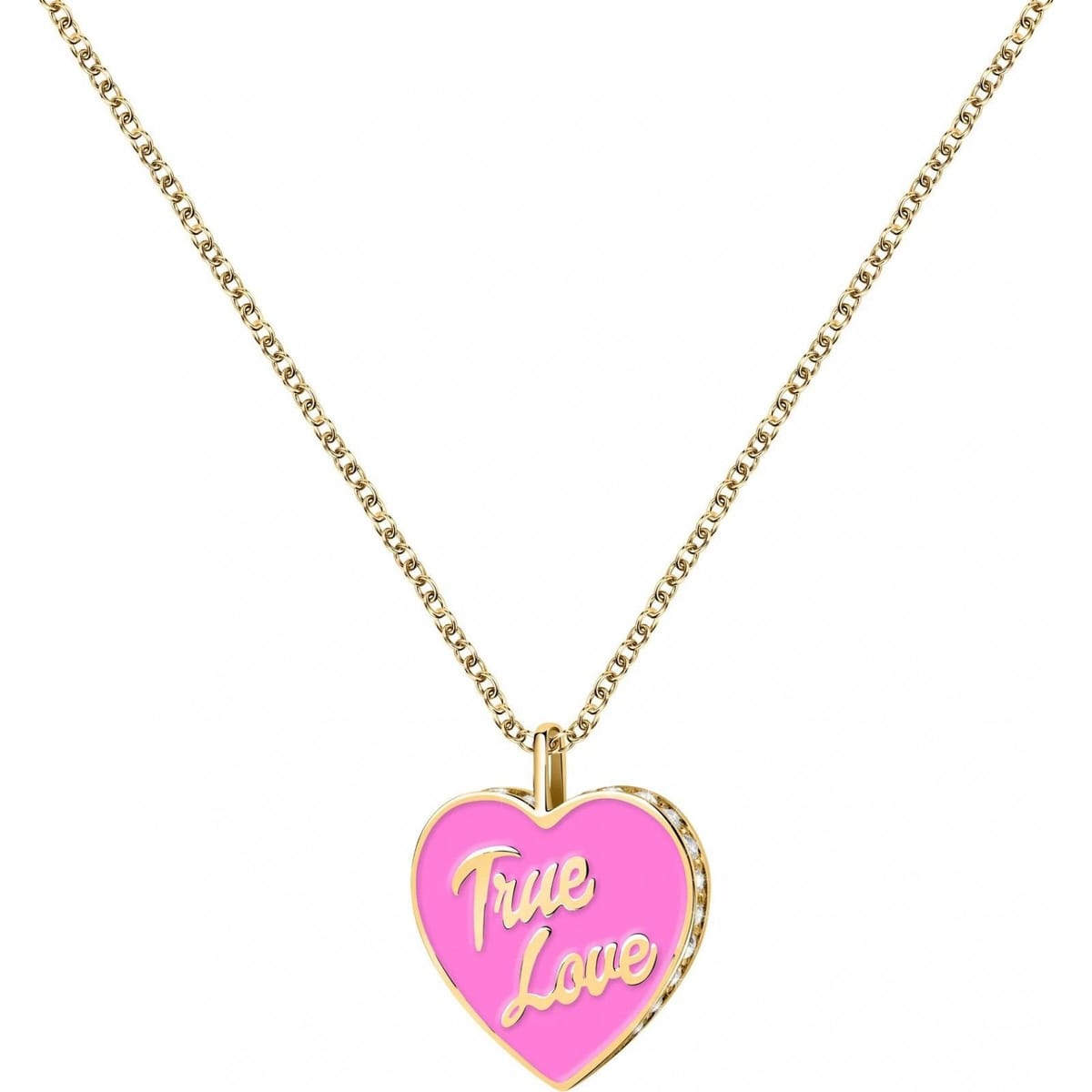 This Chiara Ferragni necklace features a pink heart pendant with the words 'True Love' engraved. Made with high-quality materials, it is a perfect accessory for any occasion.