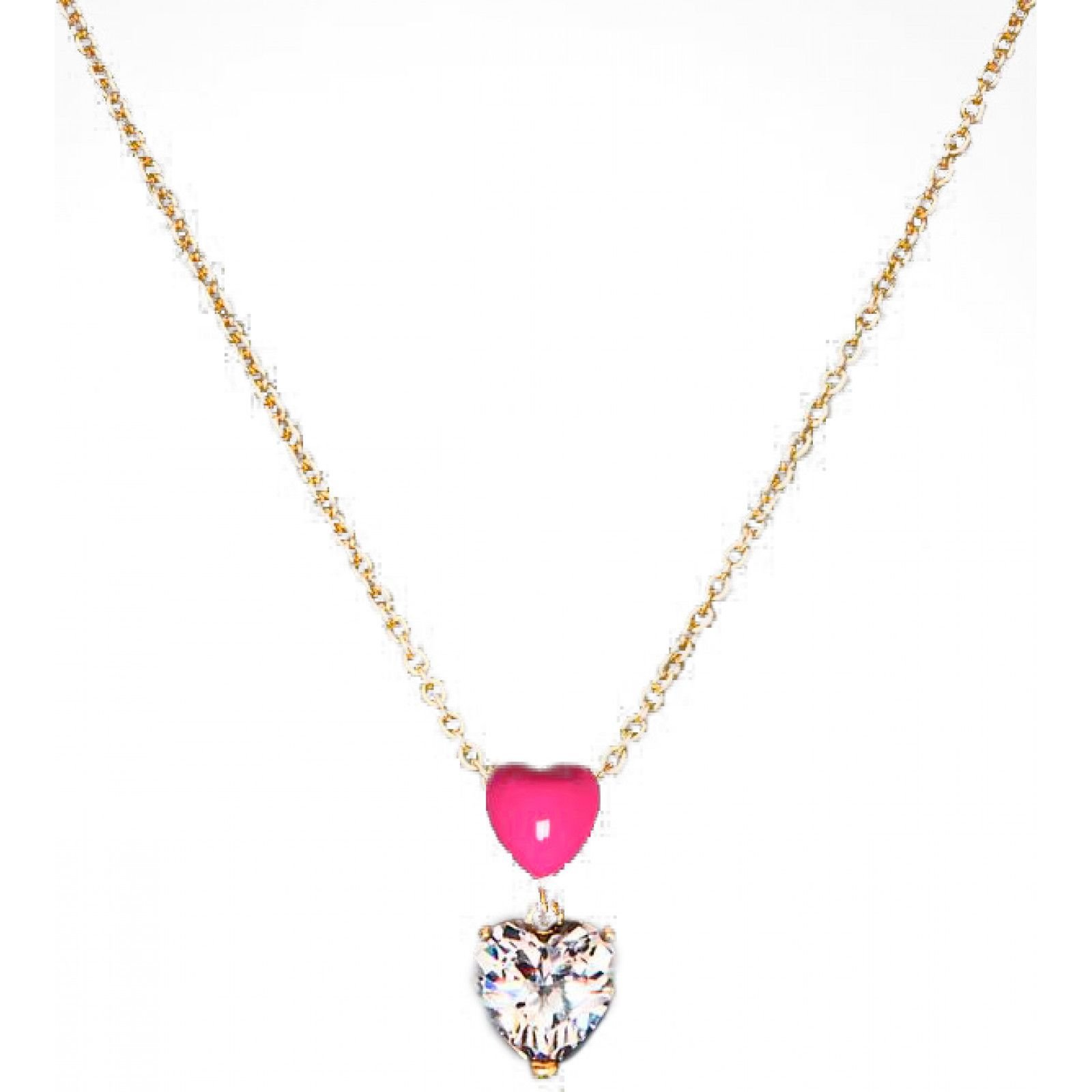 Chiara Ferragni's gold necklace features a heart pendant with a pink heart and a crystal heart. A perfect blend of elegance and charm.