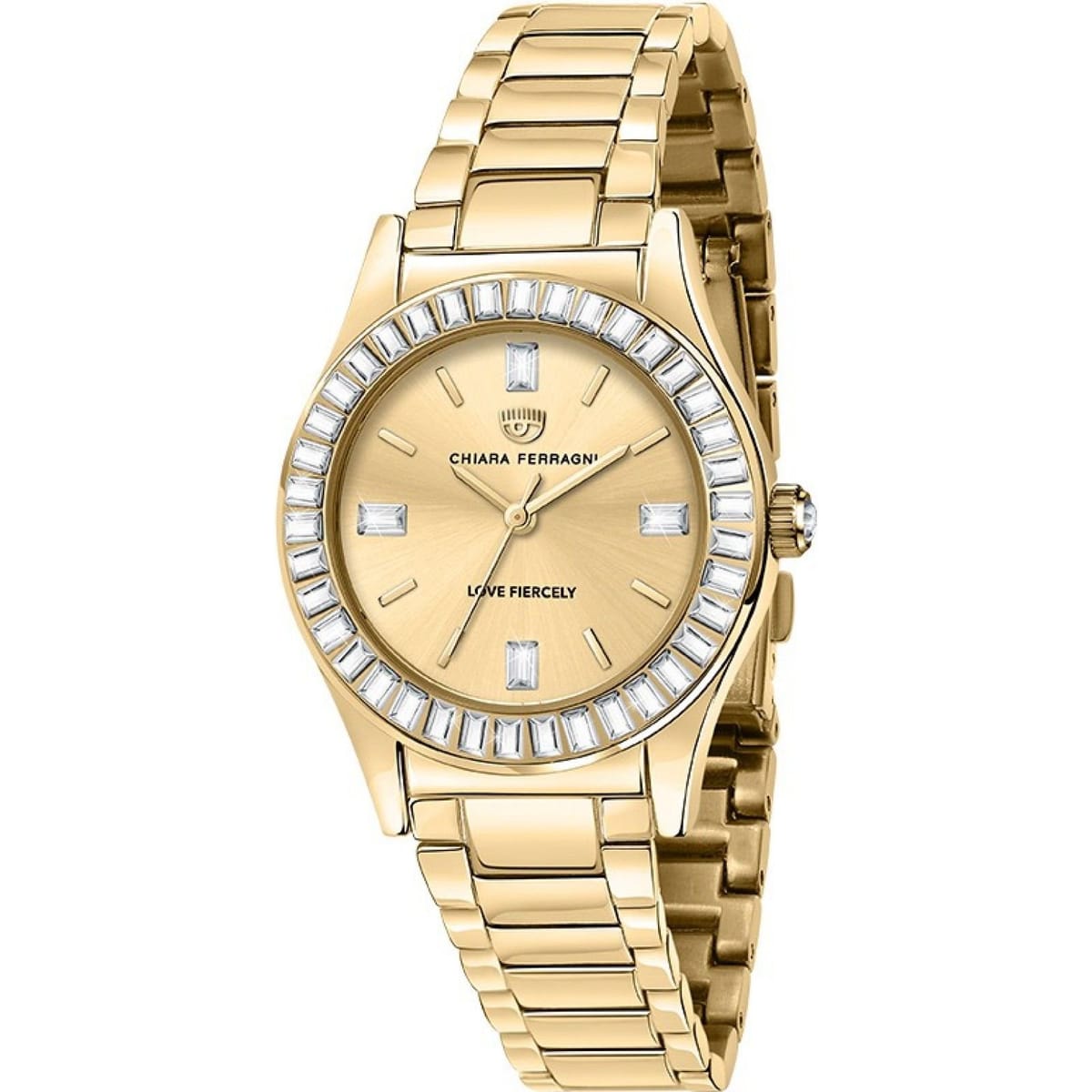 This Chiara Ferragni watch features a gold-tone metal bracelet and a gold dial adorned with crystal accents. The quartz movement ensures accurate timekeeping. Ideal for everyday wear and special occasions.