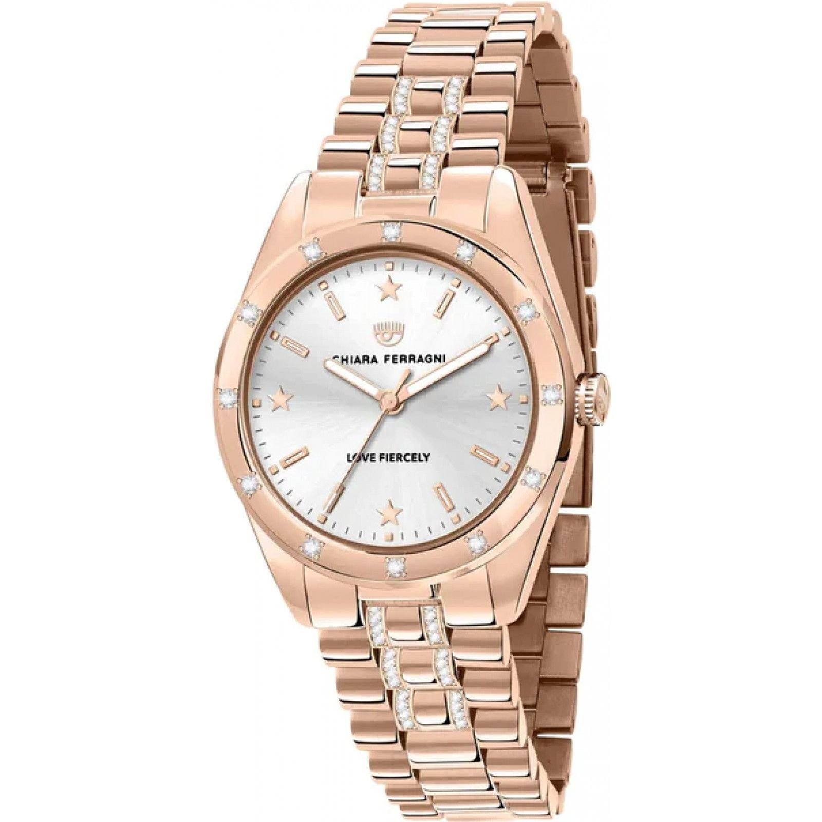 Stylish Chiara Ferragni watch in rose gold with a quartz movement. Features a diamond-studded bezel and star markers on the dial. Ideal for everyday wear and special occasions.