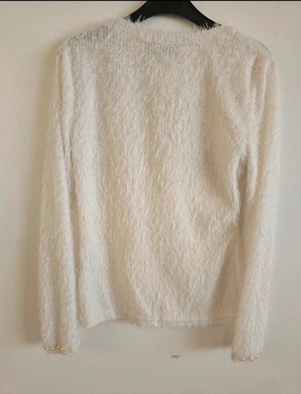 Elegant white fluffy jumper with pearl-embellished chest pockets and cuffs. Perfect for winter, dinners, or a chic everyday look.