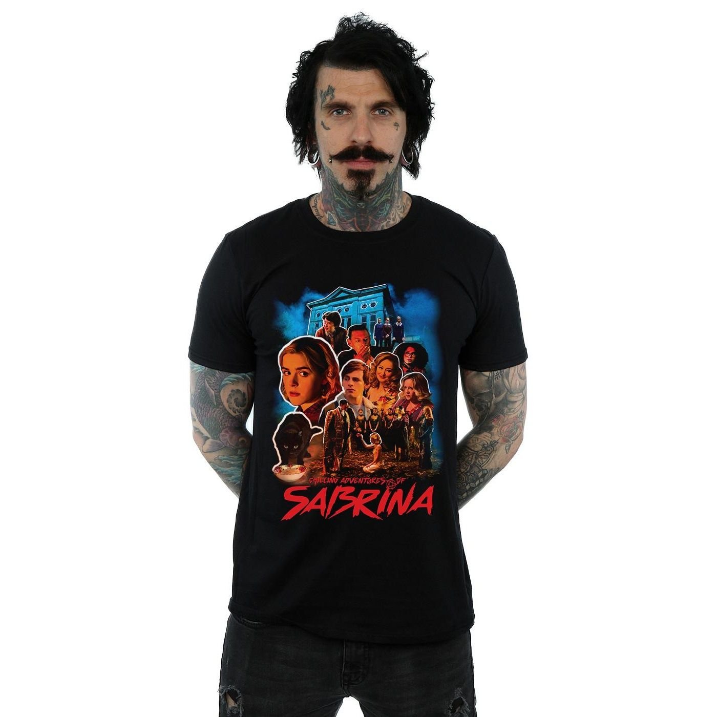 The The Chilling Adventures Of Sabrina Men's Homage T-Shirt in Black is available in sizes 2XL, 3XL, 4XL, 5XL, L, M, S, XL.