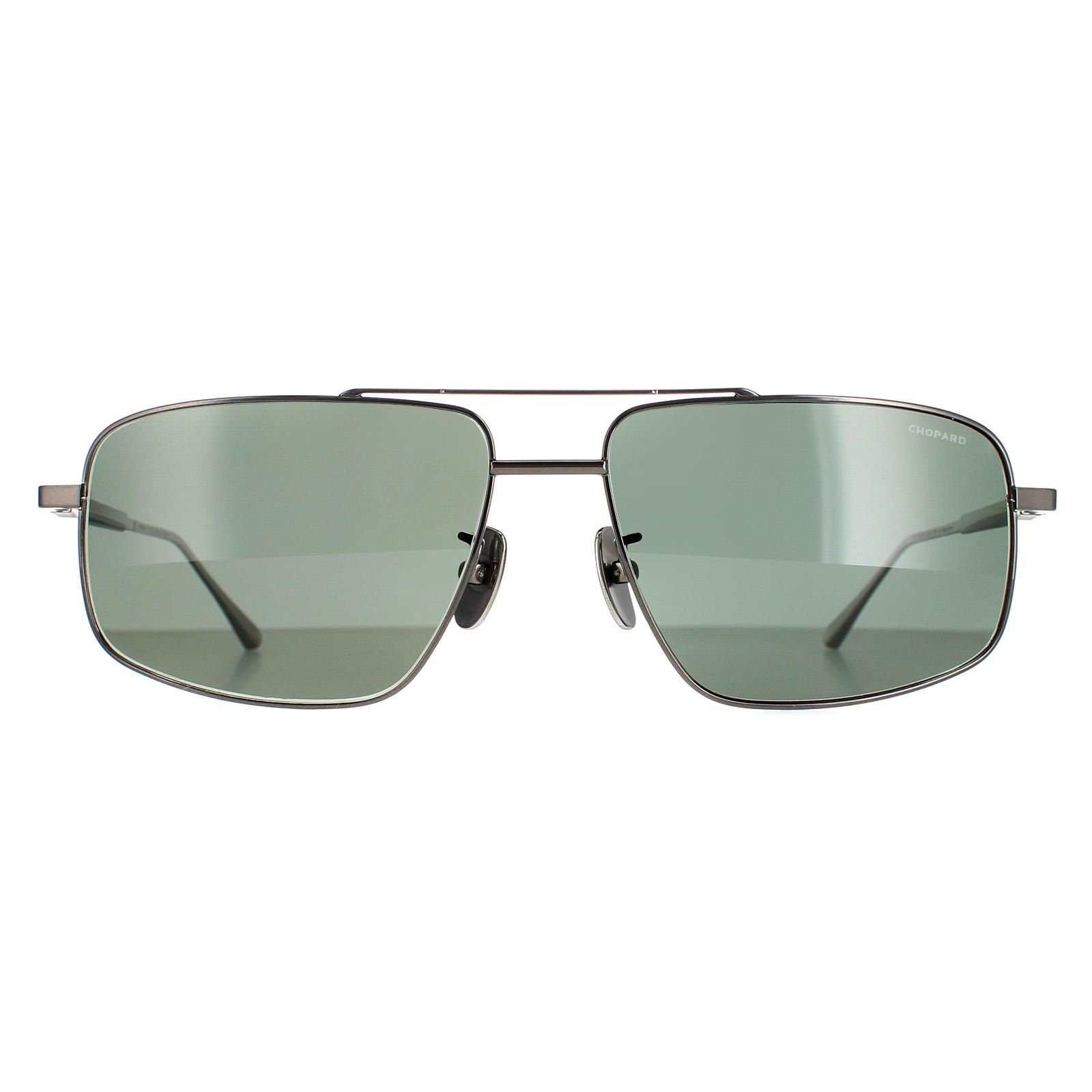 Stylish aviator sunglasses in gunmetal grey with green polarised lenses. Crafted from lightweight metal, featuring a double bridge design and silicone nose pads for comfort. The Chopard logo is elegantly placed on the temples.