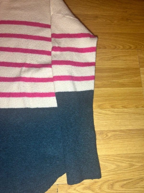 Stylish Christian Siriano jumper in size M. Features a soft knit with a flattering relaxed fit, cream base with pink horizontal stripes and a navy colour block at the bottom. Perfect for everyday wear or layering in cooler weather.