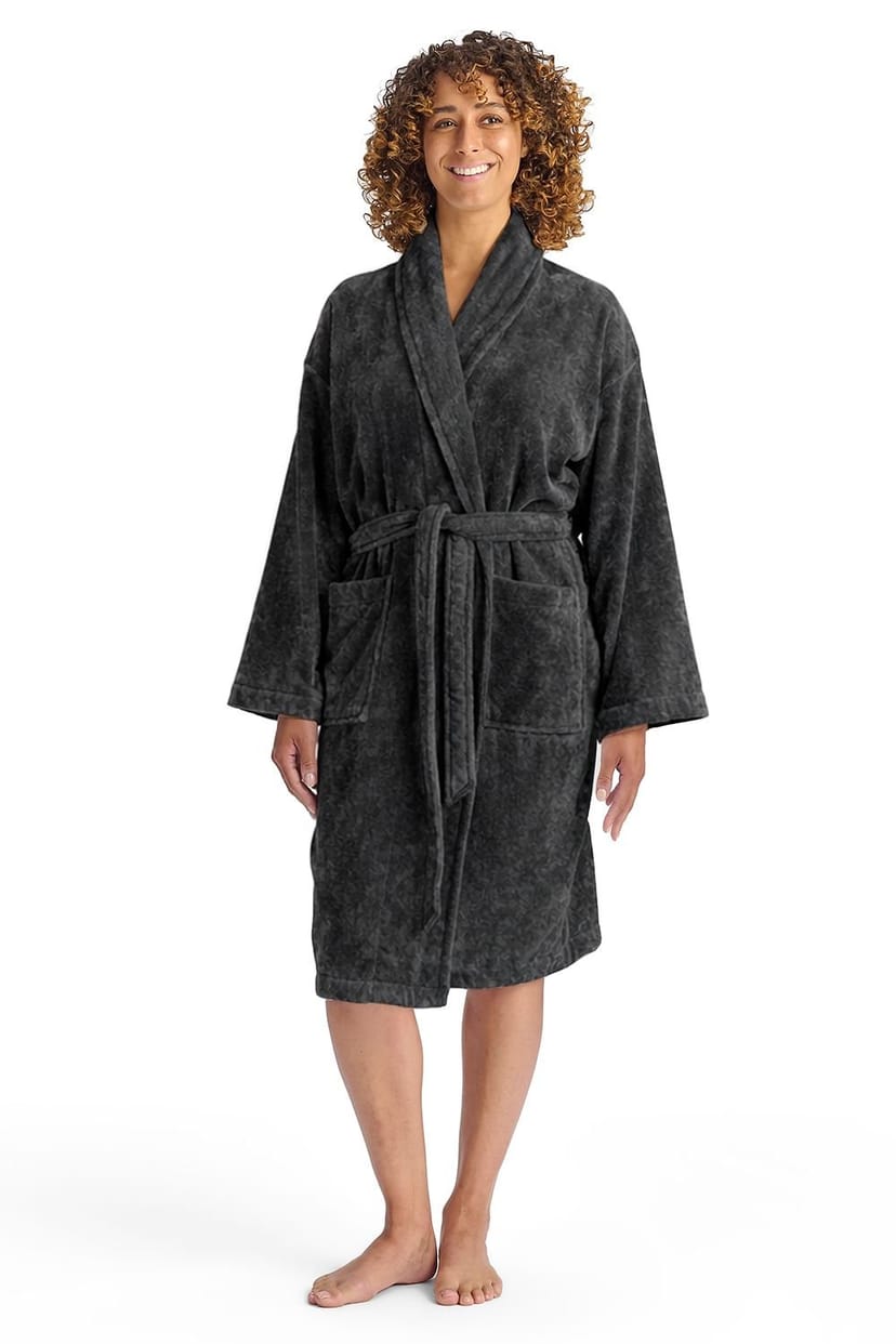 The Christy Women's Dark Grey Velour Bath Robe is ideal for lounge, spa, relaxation.