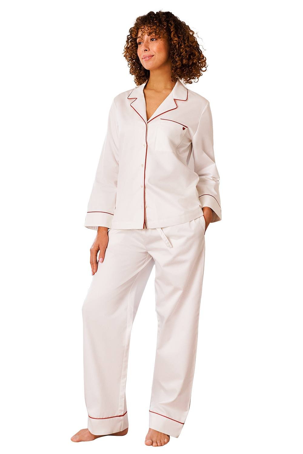 Luxurious white cotton pyjama set with a delicate red embroidered heart. Ideal for everyday luxury and special occasions.