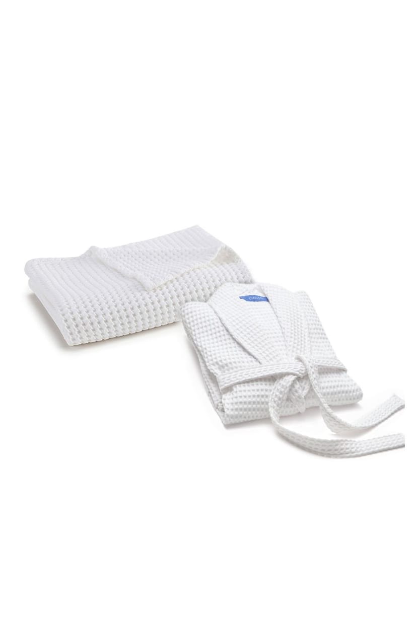 The Christy White Waffle Kimono Robe & Bath Sheet Gift Set is available in sizes l/xl, s/m.