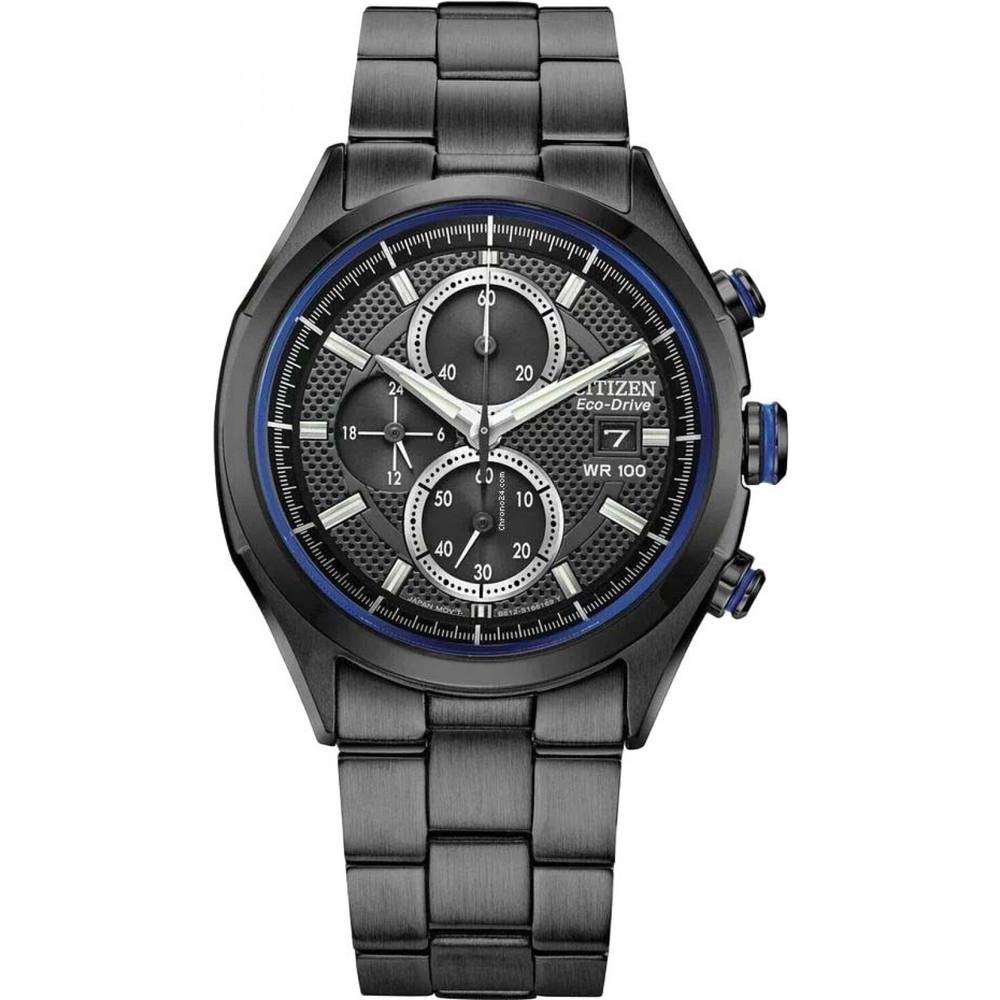 Stylish Citizen men's watch in black with a blue bezel and Eco-Drive technology. Features a black dial with silver accents and a black metal bracelet. Ideal for everyday wear and special occasions.