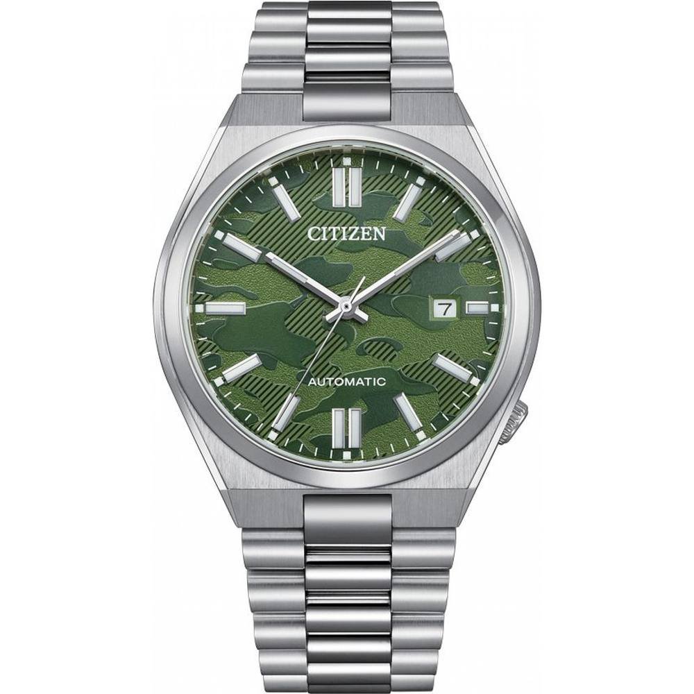Sleek Citizen automatic watch in silver with a camouflage dial and stainless steel bracelet. Designed for durability and style, it's perfect for everyday wear.