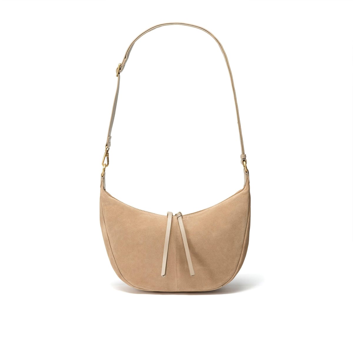 Elegant Clarks Willow Moon shoulder bag in taupe suede. Features a sleek half-moon silhouette and a single adjustable strap for versatile wear. The flap closure with two straps adds a touch of sophistication. Ideal for everyday use.