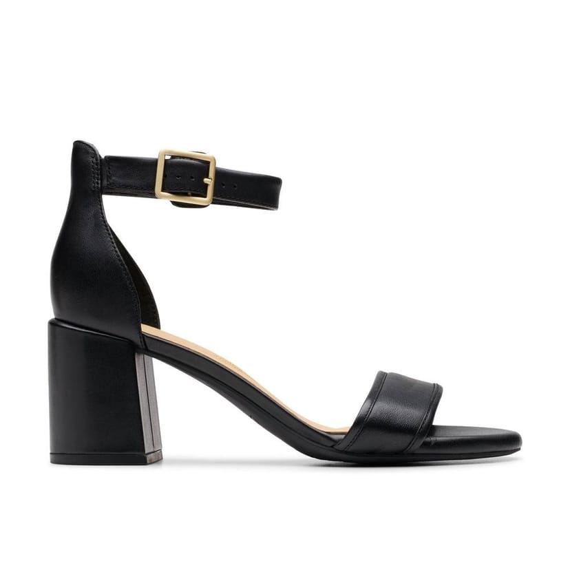View Debenhams's returns policySophisticated black leather heeled sandals from Clarks. Featuring a flared heel and a signature foam footbed, these shoes are perfect for special occasions and evening outings.