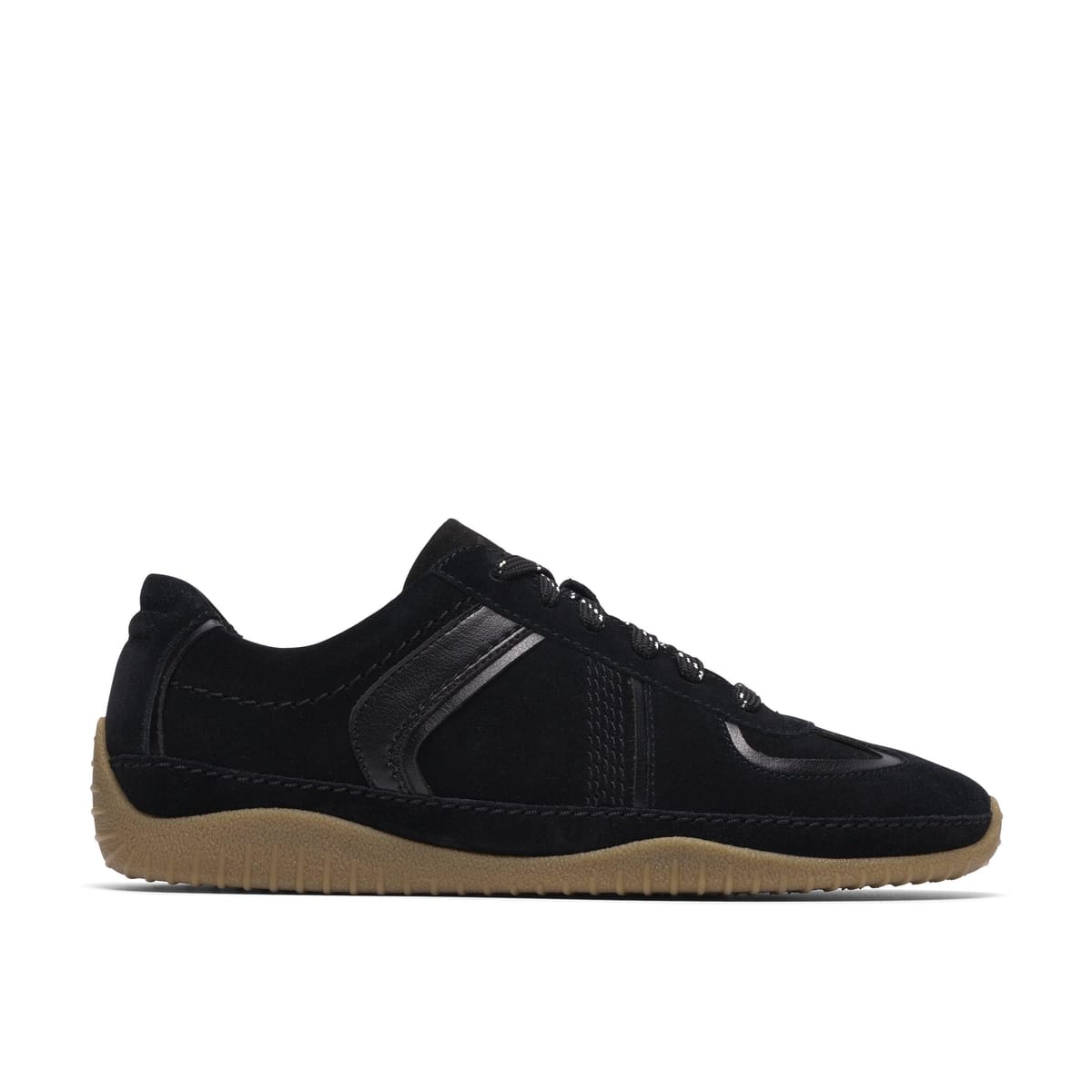 Sleek black suede trainers from Clarks featuring a low-profile silhouette and soft suede for comfort. The modern design blends heritage craft with contemporary style.