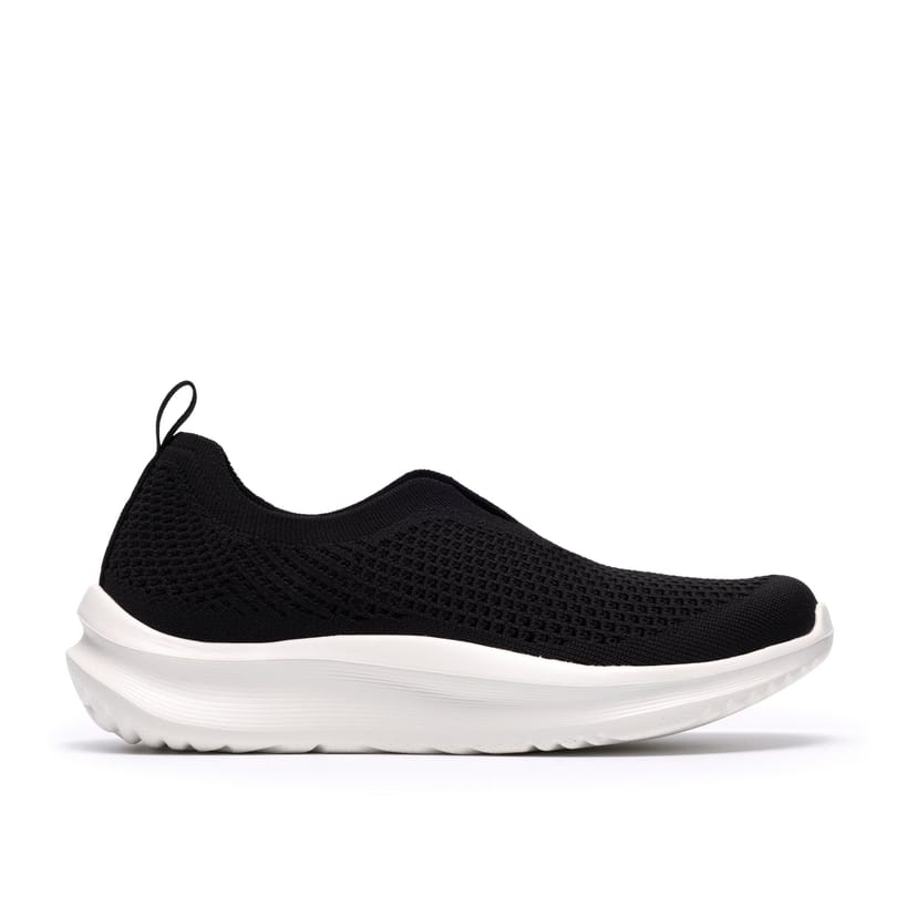 Stylish Clarks Solevana Knit slip-on shoes in black. Designed for all-day comfort with a breathable upper and cushioned sole. Perfect for casual wear and everyday activities.