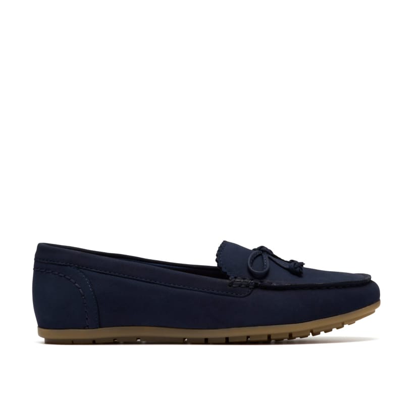 The Clarks Women's Elliotte Sail Navy Nubuck Loafers is available in sizes 5-standard fit, 6-standard fit, 7-standard fit, 8-standard fit.