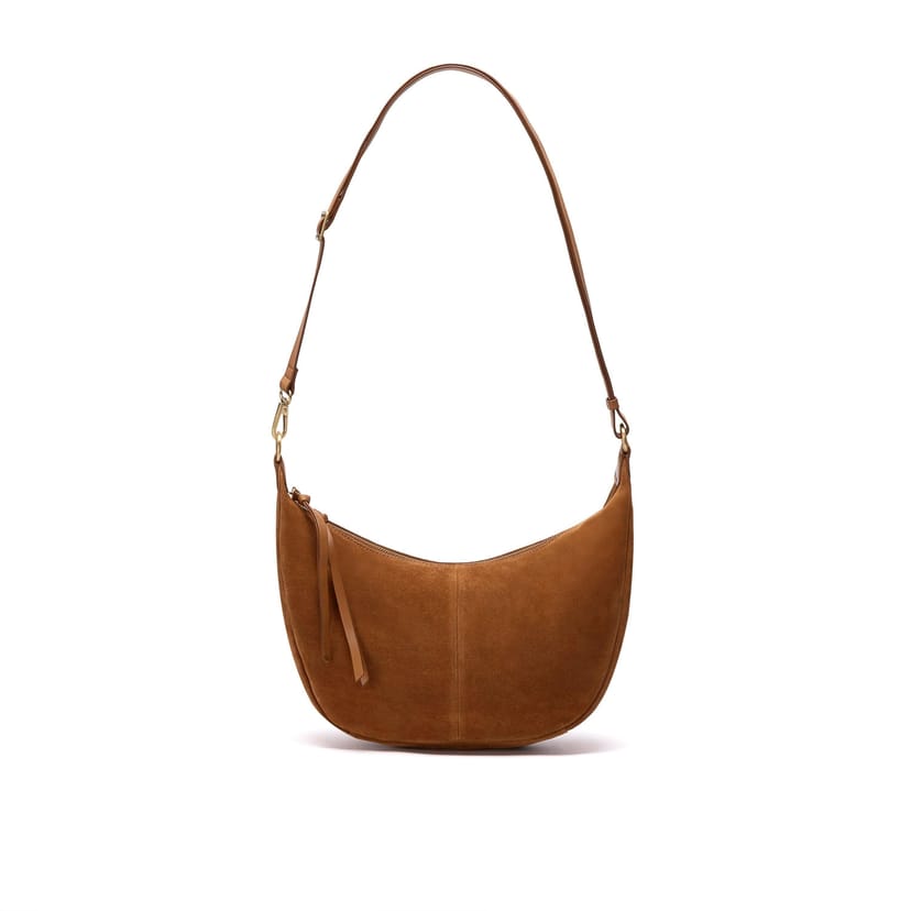 This Clarks Willow Moon shoulder bag is a versatile accessory in tan suede, featuring a sleek half-moon silhouette. Ideal for everyday use, it can be worn over the shoulder or as a cross-body bag.