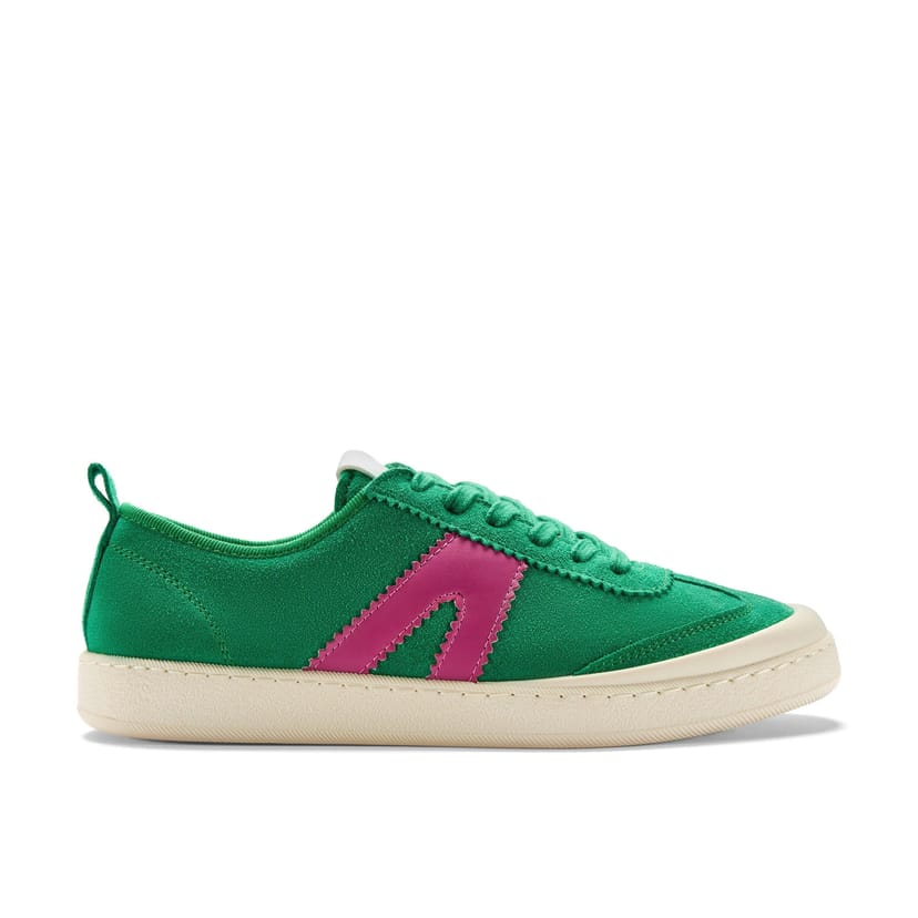Modern Clarks Coralea Lace trainers in green synthetic with a statement pink 'N' logo. Designed in Italy, these trainers combine refined European craftsmanship with a bold aesthetic.