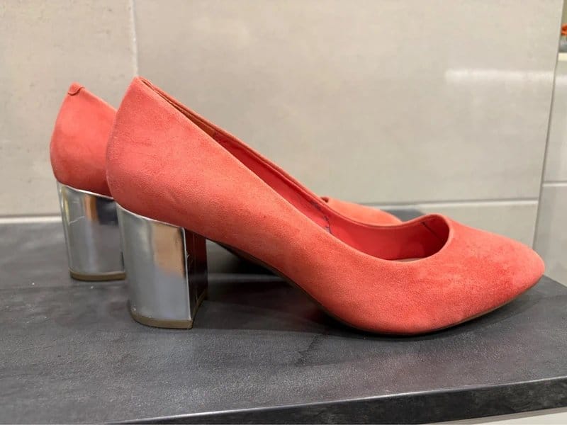 These gorgeous and super comfy Clarks Blissful Cloud shoes are a size 7 1/2 E, offering a wide fitting. Featuring a court shoe style with rounded chunky silver soles, the uppers are made from orange suede. With cushioned soles, a 7cm heel height, and a 1cm front platform, they are easy to walk in.