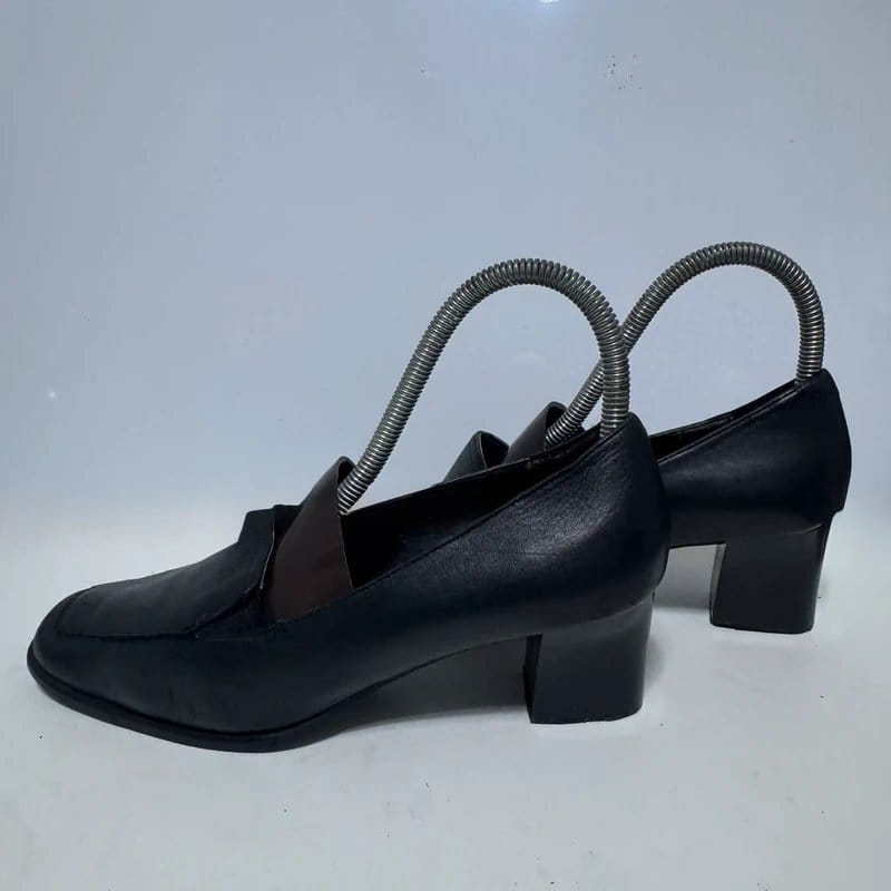 Authentic vintage Clarks heeled loafers in smooth black leather. Featuring a stylish square toe and a sturdy block heel, these shoes offer a perfect 90s/Y2K office-chic vibe.