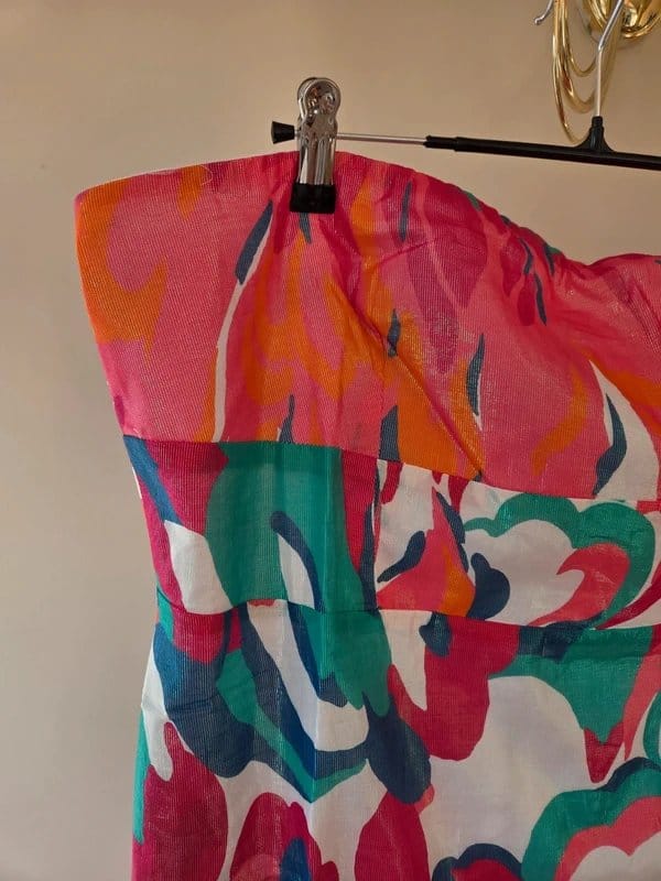 Vibrant multicolor floral strapless dress with an iridescent shimmer. Features pink, orange, blue, turquoise, and white colors with pockets. Ideal for summer or wedding guest events.