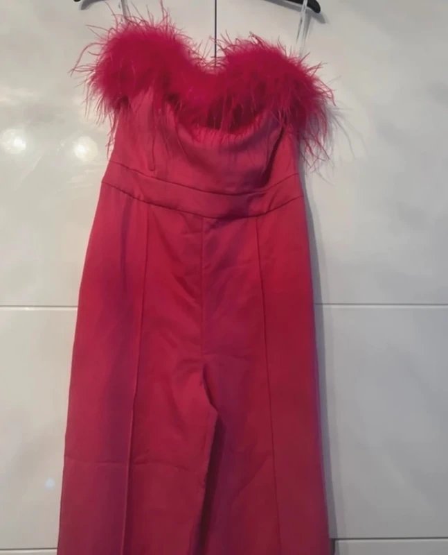 The Club L Pink Feather Corset Jumpsuit is available in sizes S.