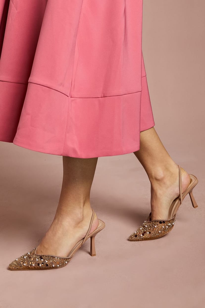 Chic beige faux leather court shoes with sequin mesh detailing across the pointed toe. Features an elegant slingback design with a delicate strap for a secure fit. The medium stiletto heel measures between 5-6.5cm, adding a touch of sophistication while ensuring comfort.