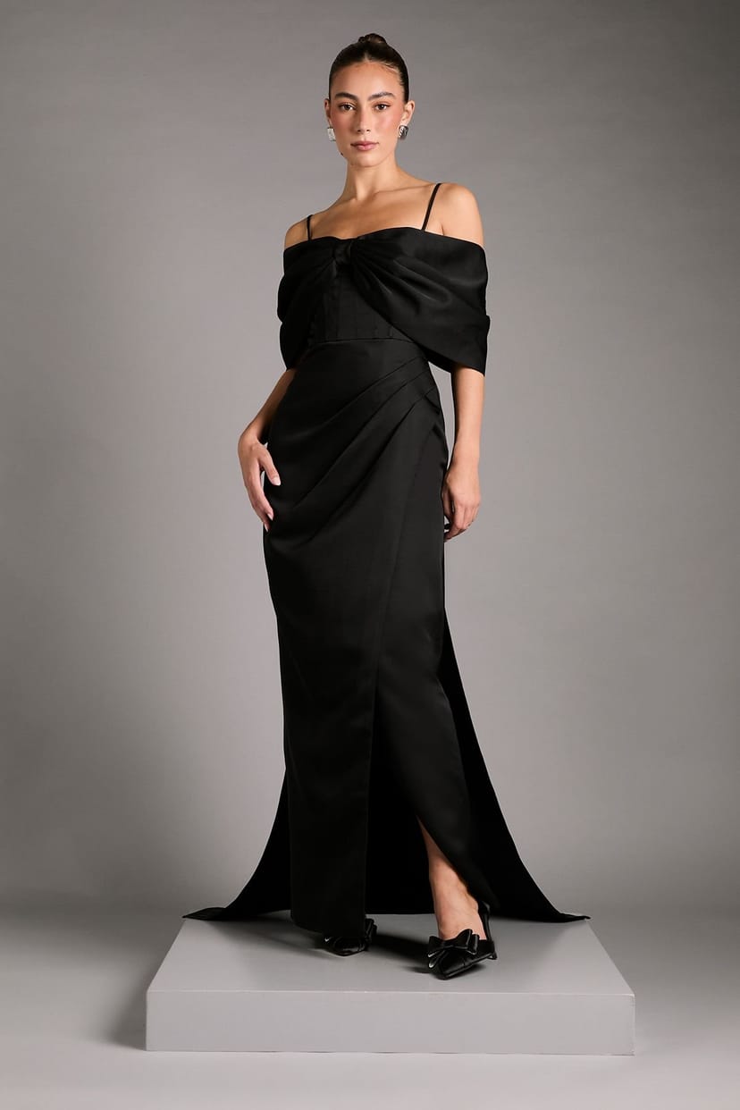 The Coast Black Satin Bardot Dress With Bow Back Detail is ideal for evening, date-night, party.