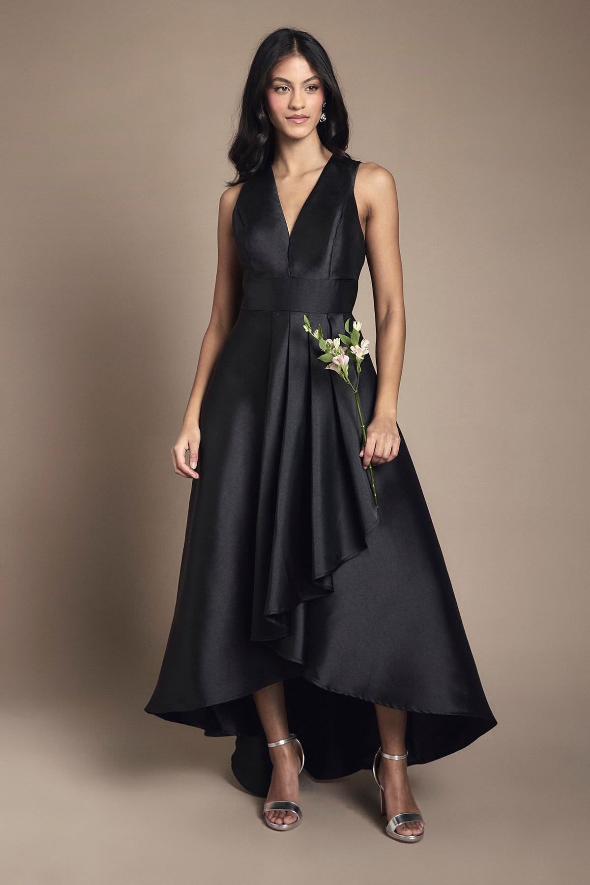 Elegant black twill waterfall dress with a deep V-neckline and wide shoulder straps. Features a fitted bodice and a cinched waist, perfect for bridesmaids.