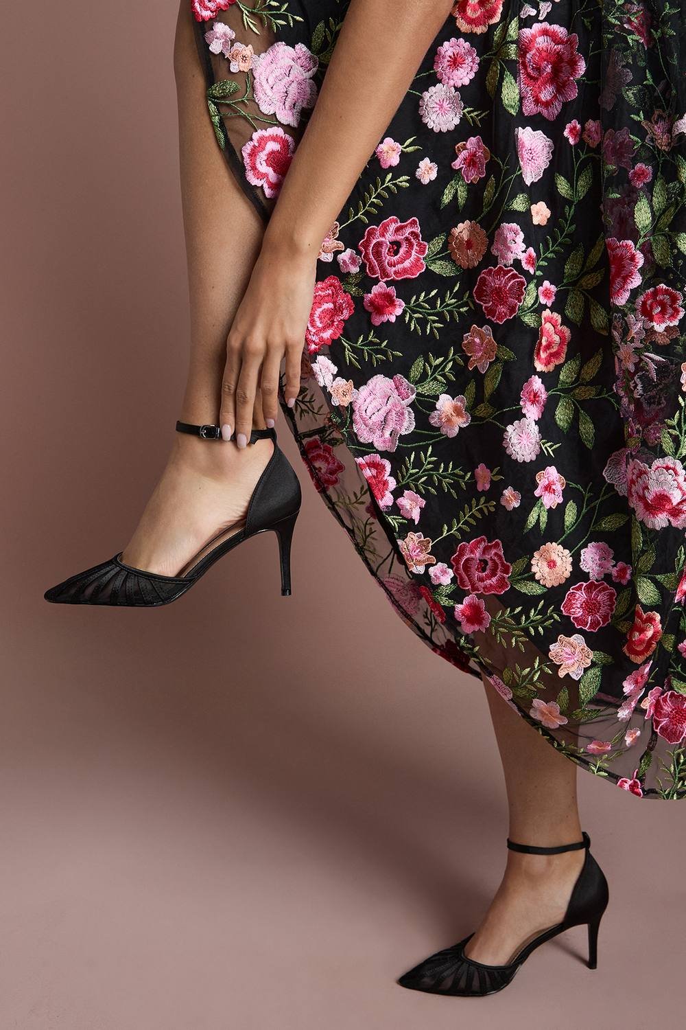 Elegant black satin court shoes with delicate mesh detailing for a sophisticated finish. Sleek ankle strap with secure fastening for added stability and style. Pointed toe design creates a flattering, elongated silhouette. High stiletto heel measuring between 7-9cm adds graceful height.