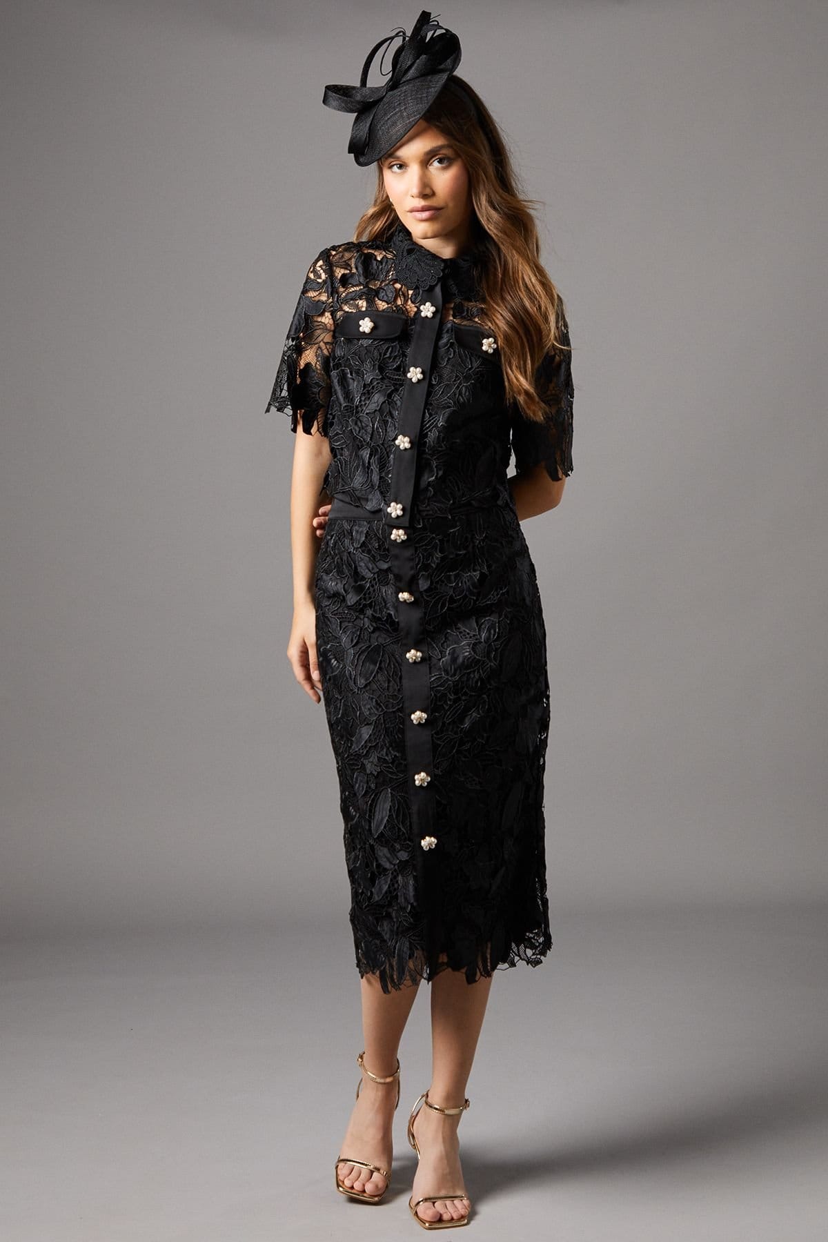Sophisticated black lace dress with pearl button detailing down the front. Figure-hugging pencil silhouette and midi length for a striking impression at special occasions.