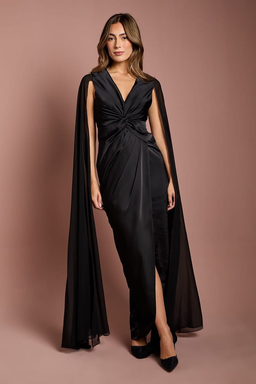 Elegant black satin floor-length dress with dramatic cape sleeves and a flattering wrap neckline. Features a sophisticated twist detail at the waist and an alluring front split. The V-shaped back adds a touch of allure.