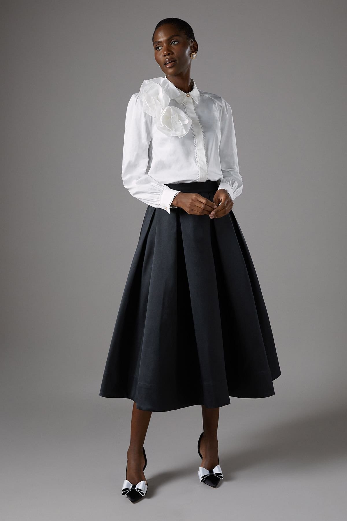 Voluminous A-line skirt in black twill fabric. High-waisted design with pleats for added texture. Midi length for versatile styling. Perfect for formal events.