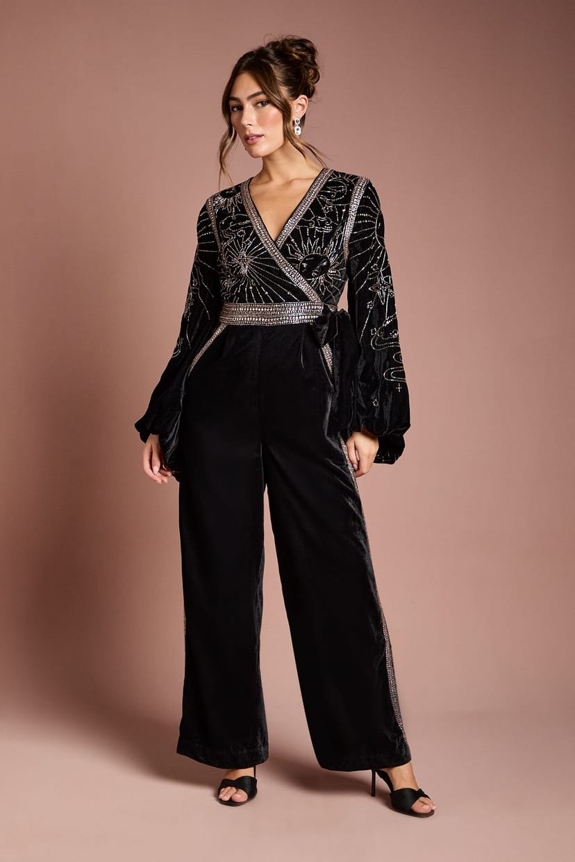 This black velvet jumpsuit features celestial-inspired embellishments across the bodice. The wrap-style V neckline creates a flattering silhouette. Statement balloon sleeves add dramatic flair, perfect for evening events.