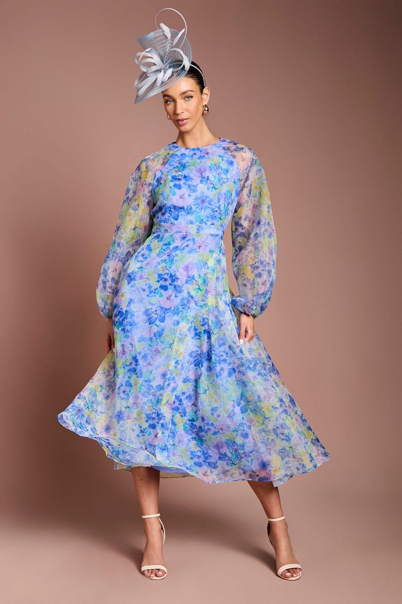The Coast Blue Floral Midi Dress with Puff Sleeves is made from organza.