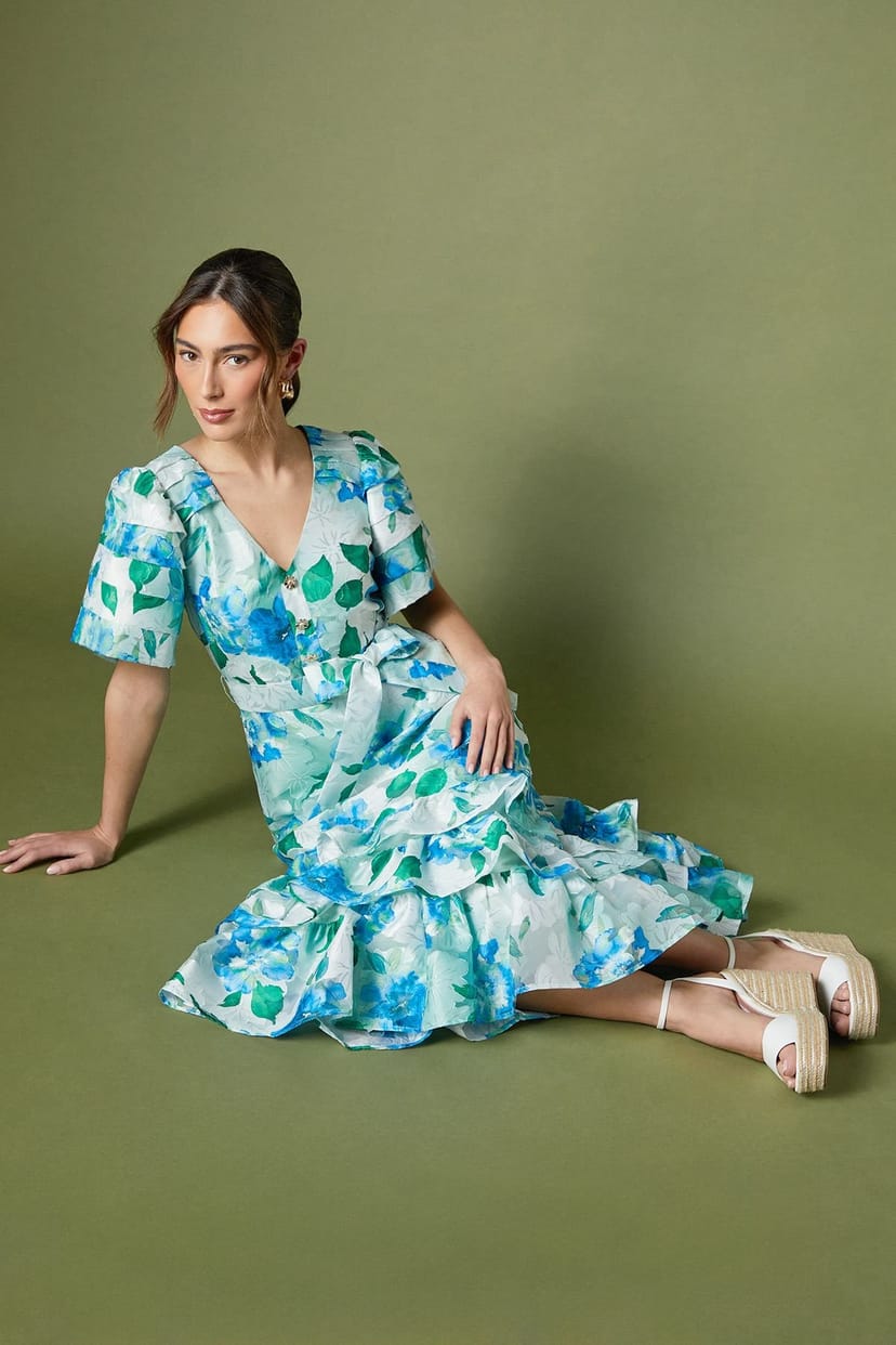 Sophisticated blue floral jacquard dress with a textured finish. Features a flattering V-neckline and feminine ruffle sleeves. The belted waist accentuates your silhouette, while the tiered ruffle hem adds movement and dimension. Ideal for various formal occasions.