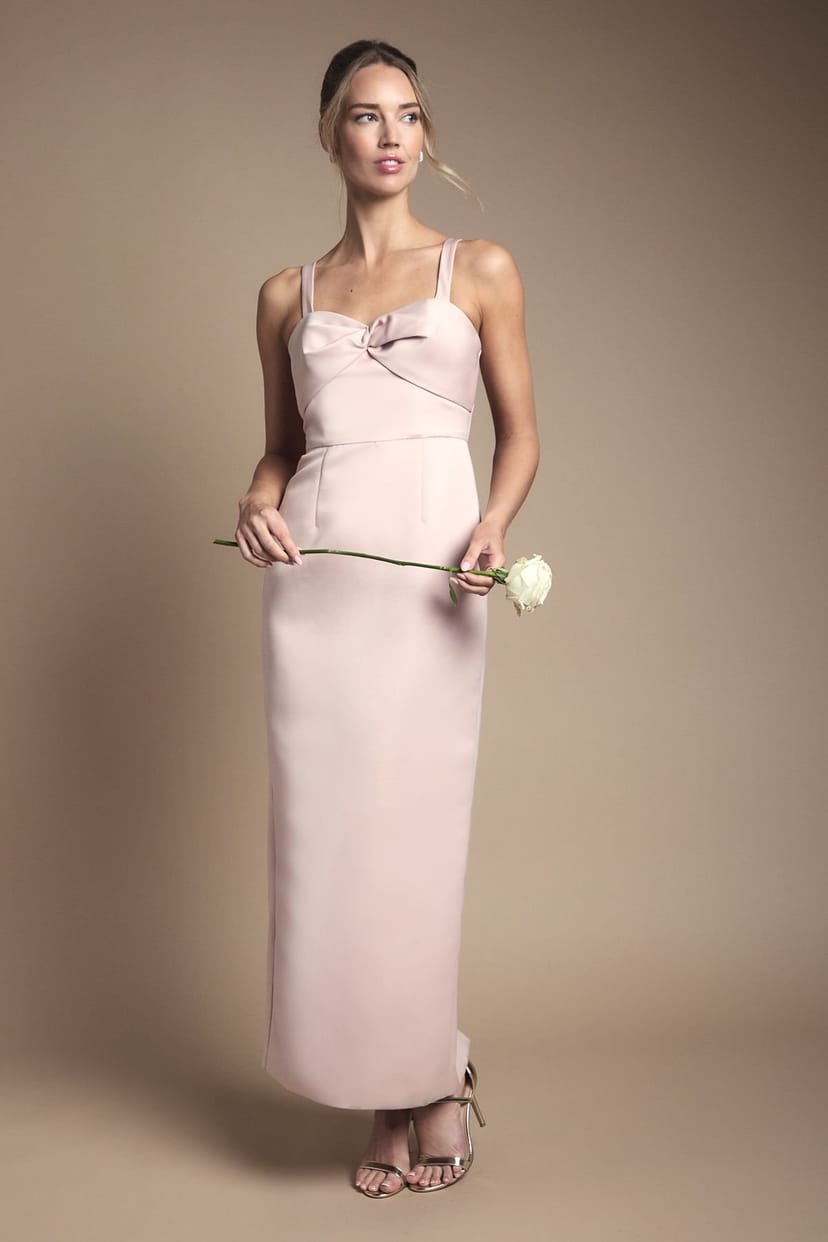 Sophisticated Blush crepe bridesmaid dress with a sweetheart neckline and knot-front detail. Features removable straps for versatile styling and a maxi length for an elegant look. Ideal for special occasions.